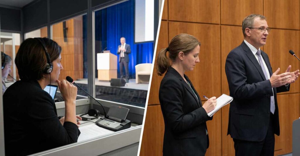 Simultaneous interpreting, on the other hand, happens almost at the same time as the speaker is talking. There are no pauses. The interpreter listens and speaks concurrently, usually through special equipment such as headsets and soundproof booths. This mode is most common at conferences, large seminars, and international events.